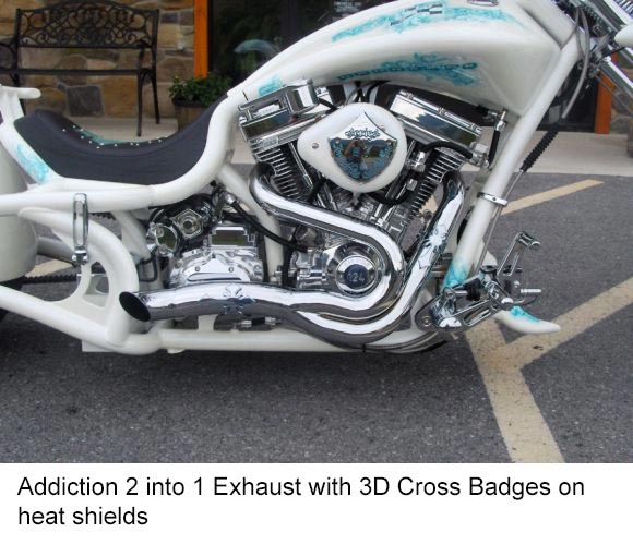 Addiction 2/1 Exhaust with custom End Cut and Addiction Cross badges on heat shields